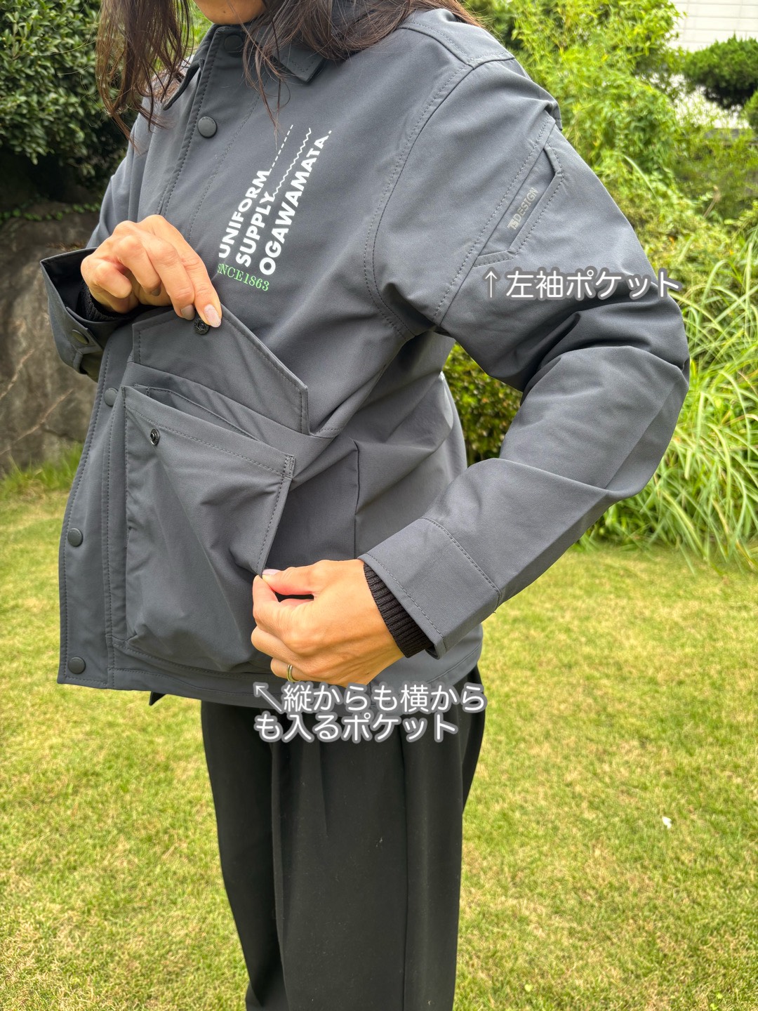 弊社の営業用ユニフォームで採用しました。軽くてかっこよくて機能性の良いアイテムです。胸ポケットは無いデザインで、胸回りがスッキリしています。両脇ポケットは、縦からも横からも入る仕組みです。大容量のポケットになっています。縦の方から入れると物が落ちない(蓋も付いています)ので大事な財布やスマホなどを入れるのに最適です!弊社では、プリントを大胆に入れました。加工映えするアイテムになっています。オリジナル感も出るので、オシャレなユニフォームを作りたい会社様、とてもおすすめです。
